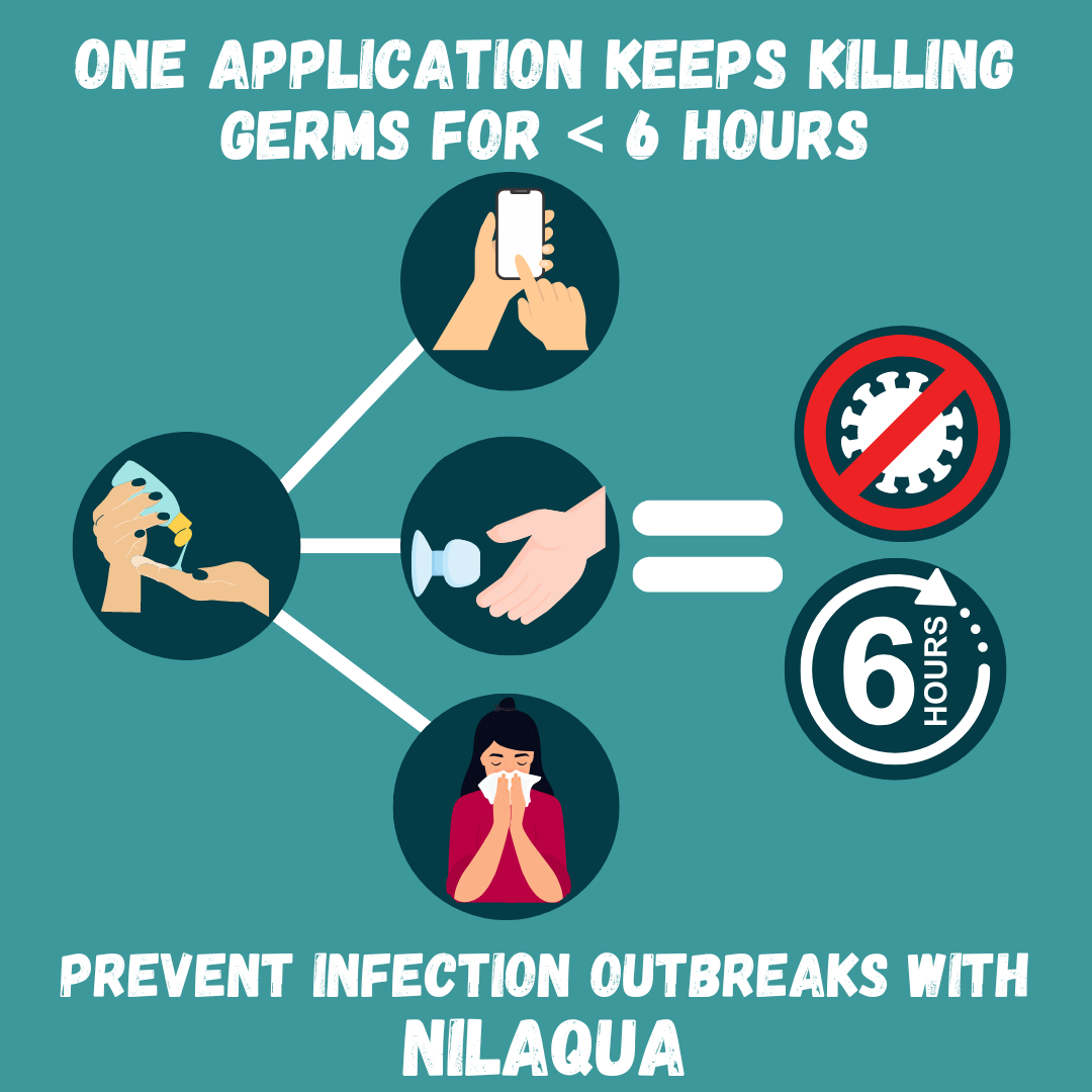 Unlike traditional alcohol sanitisers, Nilaqua® forms an invisible protective layer, proven to continually work on hands for hours. EN1500-approved, it has been tested on real people, ensuring practical effectiveness.