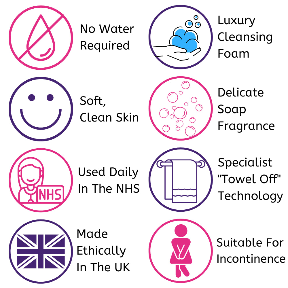 A gentle, waterless cleanser designed to provide essential daily care with dignity. This delicately fragranced foaming body wash effectively cleans skin, leaving it fresh, soft and odour free without the need for water. Can also be used with warm water for heavier soiling, efficiently removing dirt, grease, odours and incontinence-related matter.